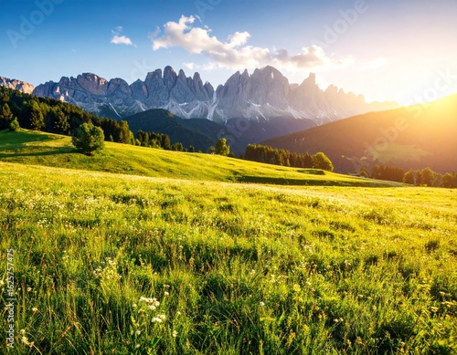Obraz premium Beautiful summer mountain landscape with green meadows, blooming wildflowers, and sunrise light over the hills. Perfect for nature, travel, outdoor adventure, seasonal themes, or eco-friendly content