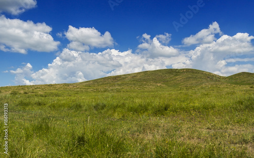 Fototapeta premium Beautiful summer steppe. Blue sky with clouds. Green landscape
