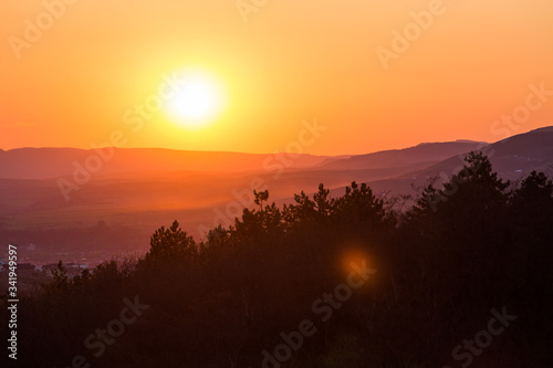 Fototapeta premium Beautiful summer sunset with trees and hills.