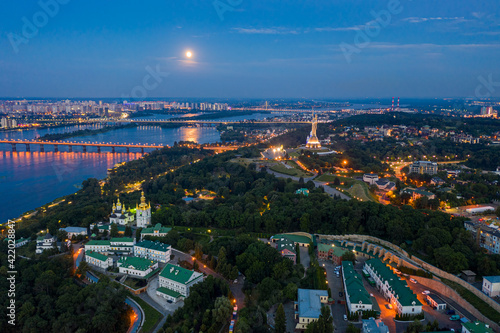 © zlatoust198323, Obraz premium Beautiful summer top view of the Kiev-Pechersk Lavra. Many churches. Beautiful panorama of Kiev in the evening.