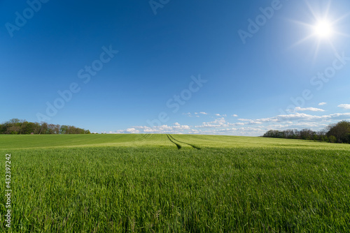 Fototapeta premium Beautiful sun on a green wheat field and blue sky