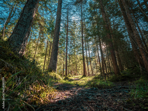 © neil, Fototapeta premium Beautiful sun rays shine through the trees in a mountain pine forest as a footpath mountain trail leads into the forest.
