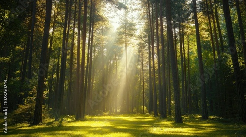 Fototapeta premium Beautiful sunbeams streaming through a dense forest of tall trees, casting light on the forest floor and creating a tranquil atmosphere