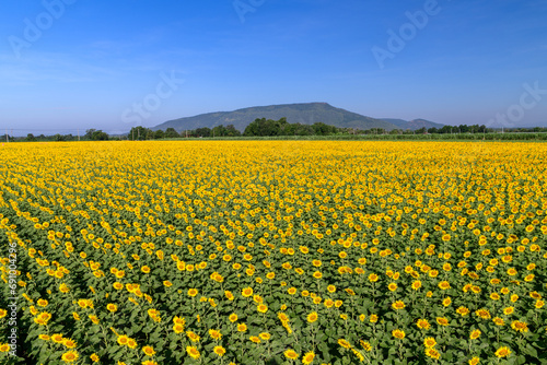 © kwanchaichaiudom, Fototapeta premium Beautiful sunflower blooming in sunflower field with blue sky background.