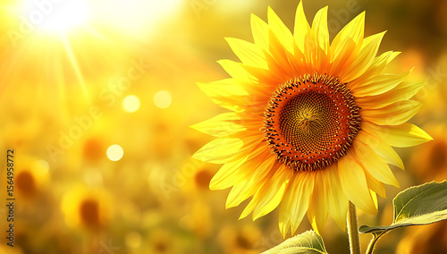 Fototapeta premium Beautiful sunflower in blurred background of field with copy space, banner design. Bright yellow color background with sun and sunlight rays. Spring or summer concept.