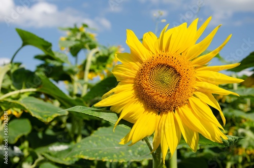 Fototapeta premium Beautiful sunflower in the middle of the field. Sunflowers in the field sky...