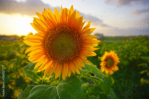 © Maria Marganingsih, Fototapeta premium Beautiful sunflowers. Sunflower garden background. Sunflower field in summer or spring season. Natural nature backgrounds with sunflowers blooming on a sunny day. Vibrant color.