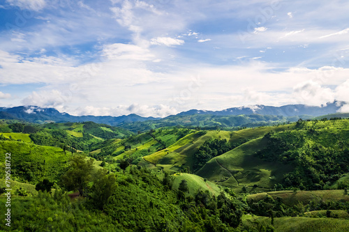 © Chalearmrat, Fototapeta premium Beautiful sunlight and blue sky with cloud over the mountain of Thailand.