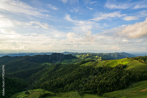 © Chalearmrat, Fototapeta premium Beautiful sunlight and blue sky with cloud over the mountain of Thailand.