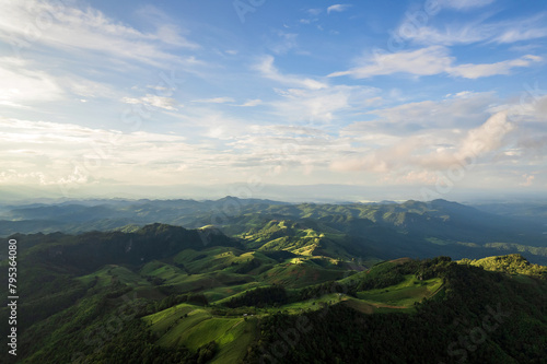 © Chalearmrat, Fototapeta premium Beautiful sunlight and blue sky with cloud over the mountain of Thailand.