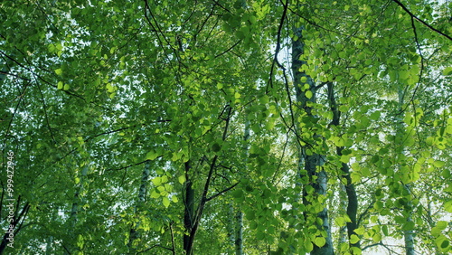 Fototapeta premium Beautiful Sunlight In Forest. Deciduous Trees In A Mixed Forest In Summer Season. Concept Nature Or Oxygen, Climate Change. Slow motion.