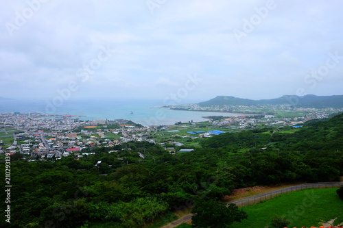 © Ray, Fototapeta premium Beautiful sunny day blue sky and white cloud view with fresh green tree and grass travel in Japan Okinawa