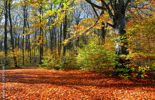 © Vitalii_Mamchuk, Obraz premium Beautiful sunny forest landscape with a tree and shadows on the lawn on an autumn day.