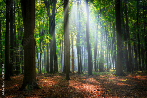 © Piotr Krzeslak, Naklejka premium Beautiful sunny morning in green forest