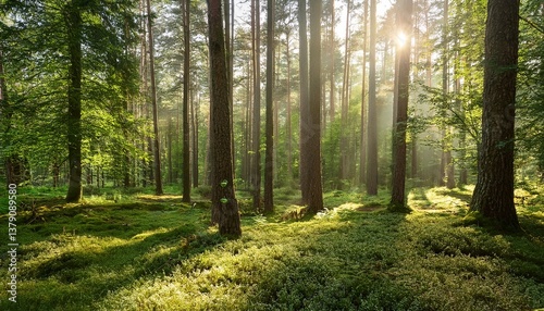 Fototapeta premium beautiful sunny morning in green forest
