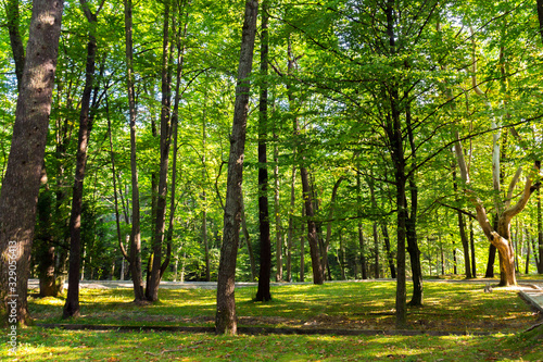© sosiukin, Naklejka premium Beautiful sunny view of tall green trees in the park