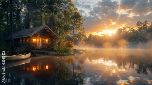 © Marco, Fototapeta premium beautiful sunrise on a lake with fog surrounded by forest and a cabin