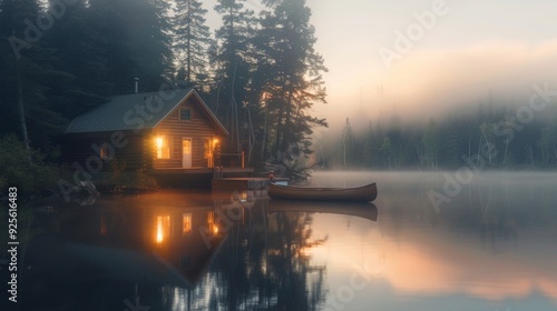 Fototapeta premium beautiful sunrise on a lake with fog surrounded by forest and a cabin