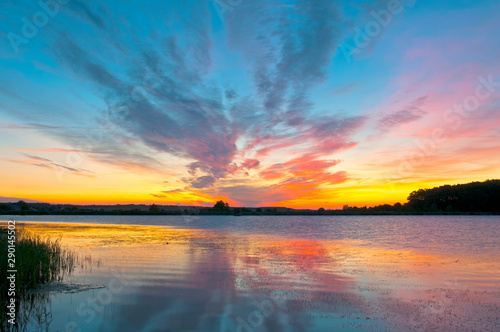 © mikhailgrytsiv, Naklejka premium beautiful sunrise on the autumn lake