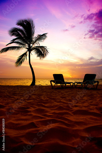 Naklejka premium Beautiful sunrise on the ocean coast, palm tree and sun loungers.