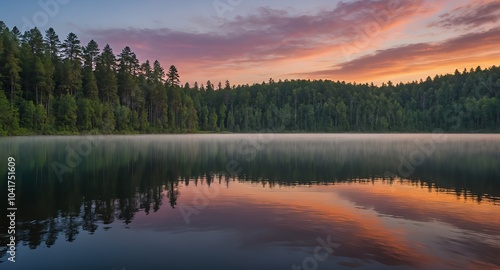 Fototapeta premium Beautiful sunrise over a tranquil lake with tents set up near the water's edge, reflecting the surrounding forest and colorful sky in the calm water