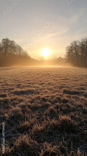 Fototapeta premium Beautiful Sunrise Over Frosty Meadow with Glazing Grass and Mist, Capturing...