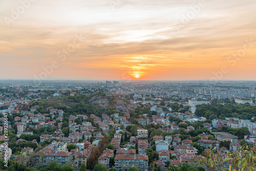 © Marin, Obraz premium Beautiful sunrise with pink and yellow clouds above Plovdiv city