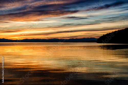 © kuzenkova, Naklejka premium Beautiful sunset above the sea and mountain
