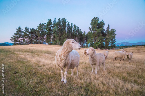© aorlyan, Obraz premium Beautiful sunset background with sheep on the agricultural field. Sheep with only one ear on the agricultural field in New Zealand. Sheep farming in Central Otago.