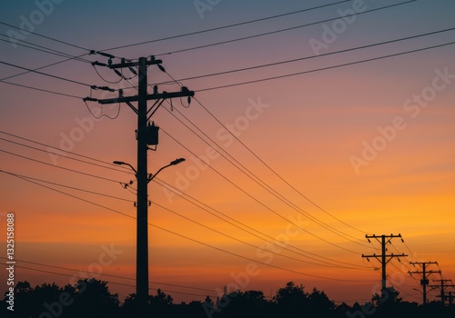 Fototapeta premium Beautiful sunset behind silhouette of power lines and telephone poles