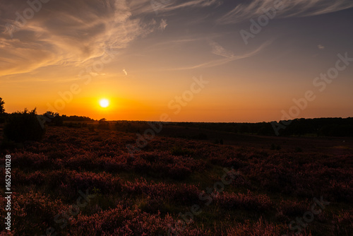 Obraz premium Beautiful sunset in the Lüneburg Heath during heather bloom.