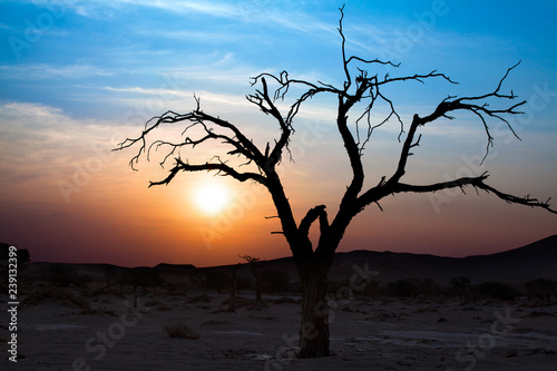 Fototapeta premium Beautiful sunset landscape, dry tree branches silhouette in the desert on bright blue, purple, red colors sky and white clouds background in Sossusvlei, Namibia