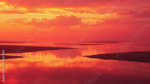 Naklejka premium Beautiful sunset on a lake. Surreal pink dusk in a distant travel destination