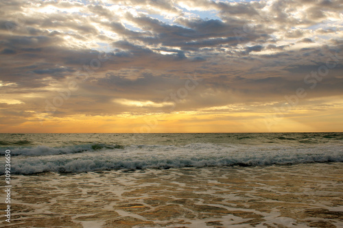 Naklejka premium Beautiful sunset on the beach. The surf pounds the shore. Phuket, Thailand