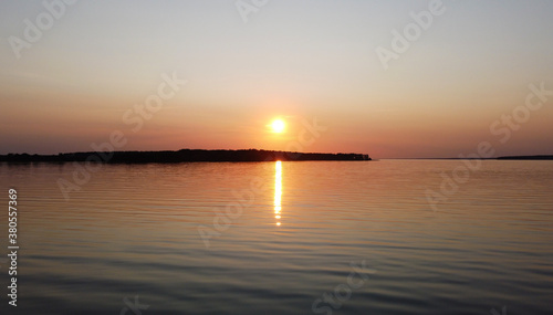 © Payllik, Obraz premium Beautiful sunset over a calm lake with reflection in the water