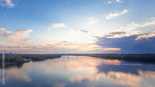 Fototapeta premium Beautiful sunset over a calm river with a boat in the water