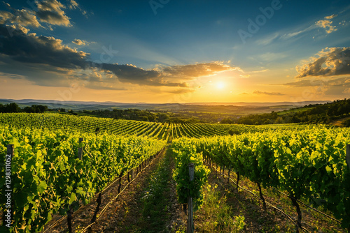 Fototapeta premium Beautiful sunset over a lush vineyard. Generative AI