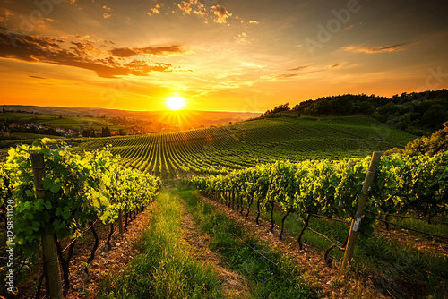 © marcin jucha, Naklejka premium Beautiful sunset over a lush vineyard. Generative AI
