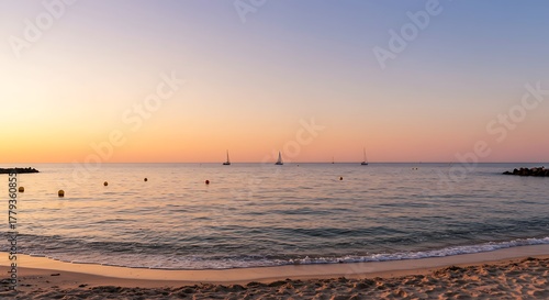 Naklejka premium Beautiful Sunset over Calm Ocean with Distant Sailboats and Sandy Beach.