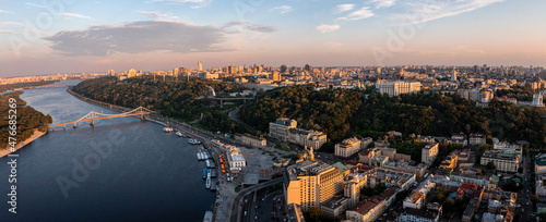 © Aerial Film Studio, Obraz premium Beautiful sunset over Kyiv city from above. Magical city center view.