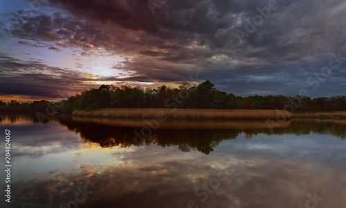 Fototapeta premium Beautiful sunset over lake with reflection in water, majestic clouds in the...