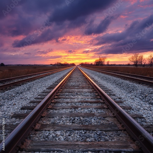 © Nur, Fototapeta premium Beautiful Sunset Over Railway Track Surrounded by Dramatic Clouds
