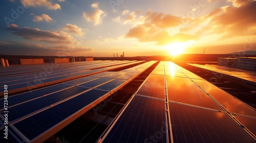 © Ghiska, Fototapeta premium Beautiful sunset over solar panels. Generate AI image