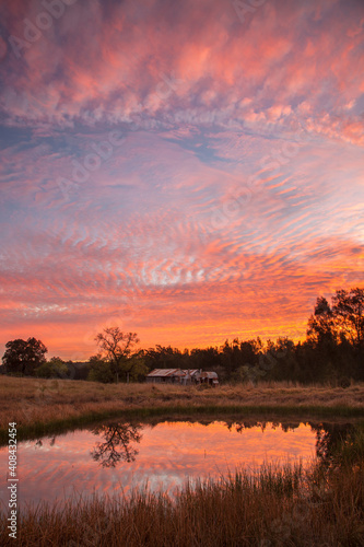 Fototapeta premium Beautiful sunset over Teds Hut and dam .Sedgefield near Singleton. Hunter Valley of N.S.W. Australia.
