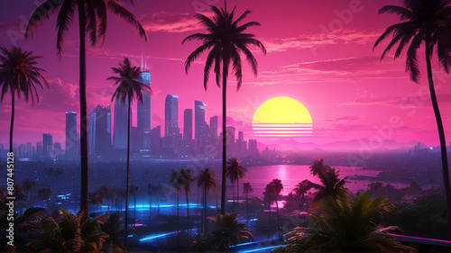 © Fitrah, Naklejka premium Beautiful sunset over the city with palm trees and skyscrapers
