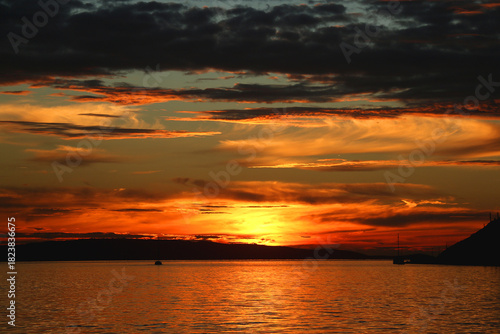 © jelena990, Fototapeta premium Beautiful sunset over the sea in Split, Croatia.
