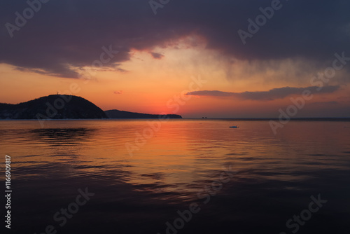 © Юлия Тарабанова, Obraz premium Beautiful sunset over the sea. Vladivostok.