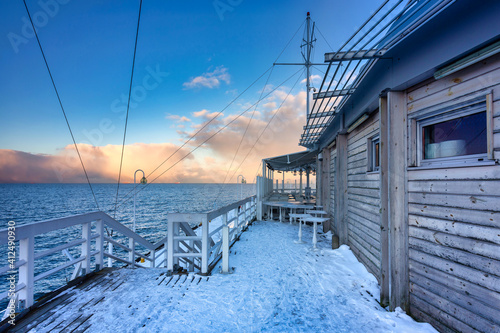 © Patryk Kosmider, Obraz premium Beautiful sunset over the snowy pier (Molo) in Sopot at winter. Poland