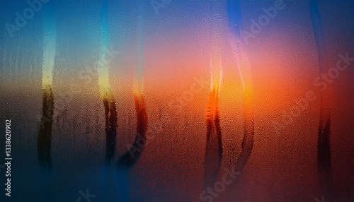 © eliyashevskiy, Fototapeta premium Beautiful Sunset Reflected on a Window With Vapor Droplets Creating an Artistic Pattern