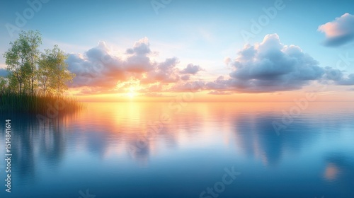 © RizalAziz, Fototapeta premium Beautiful Sunset Reflection in Calm Waters with Cloudy Sky and Sunlight